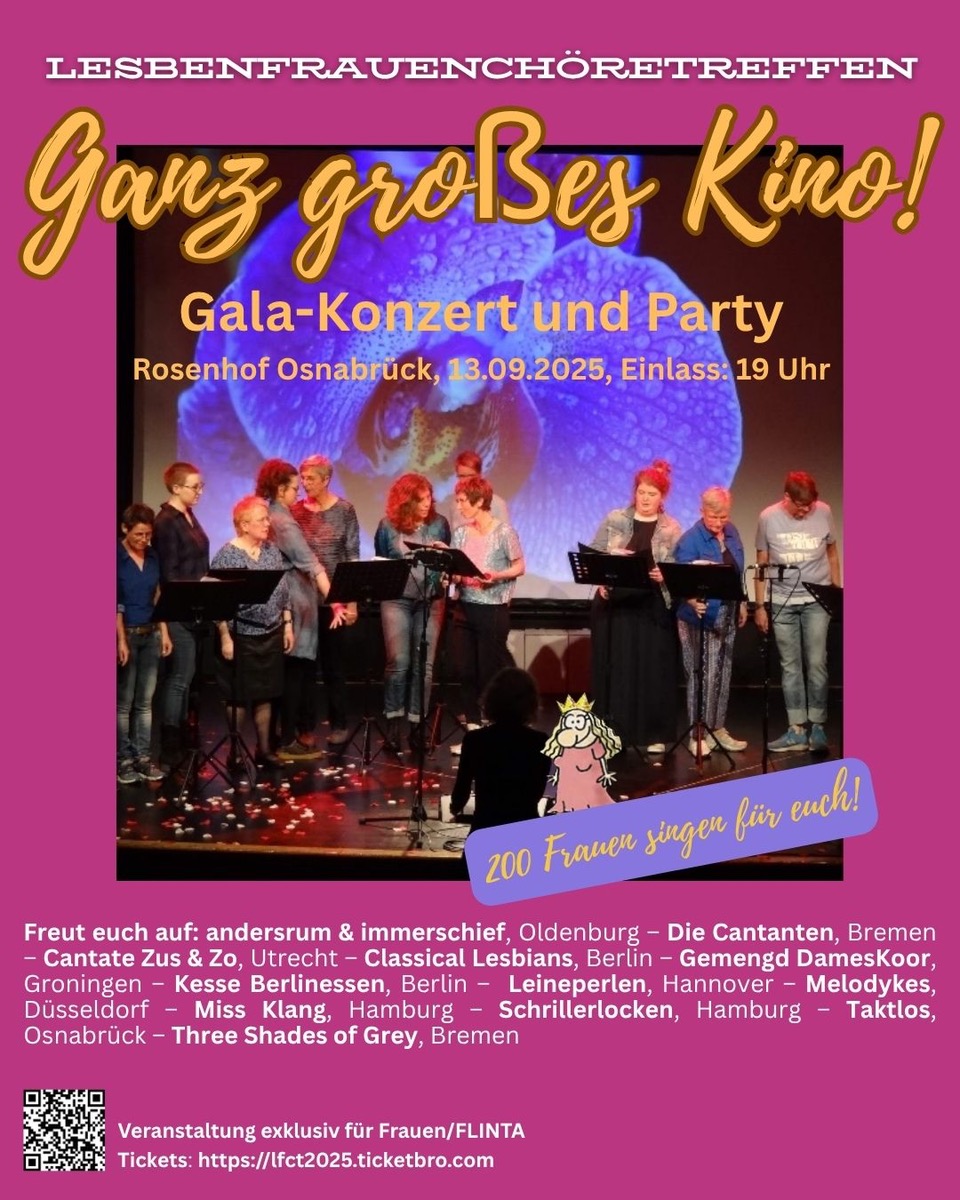 Freut euch auf eine fantastische Gala-Nacht mit 12 Chören aus Deutschland und den Niederlanden, die ihre Stimmen und Kreativität vereinen. Von klassischen Melodien bis hin zu selbstgedichteten und feministischen Hits – hier ist in einer Nacht voller Emotionen für Jede etwas dabei!