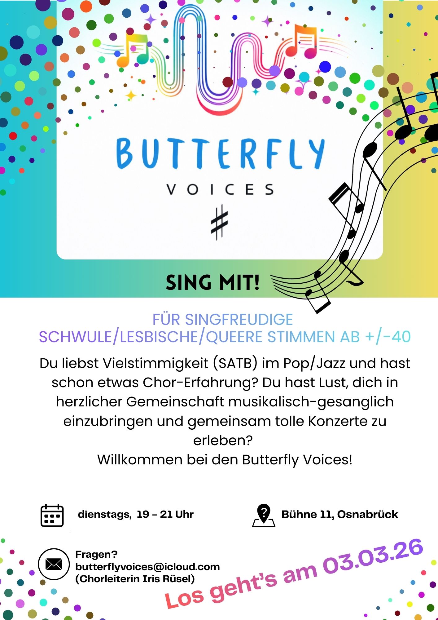 Butterfly Voices - der queere gemischte Chor für alle ab 40. Sopran, Bass, Alt oder Tenor; vielstimmig mit netten Menschen.